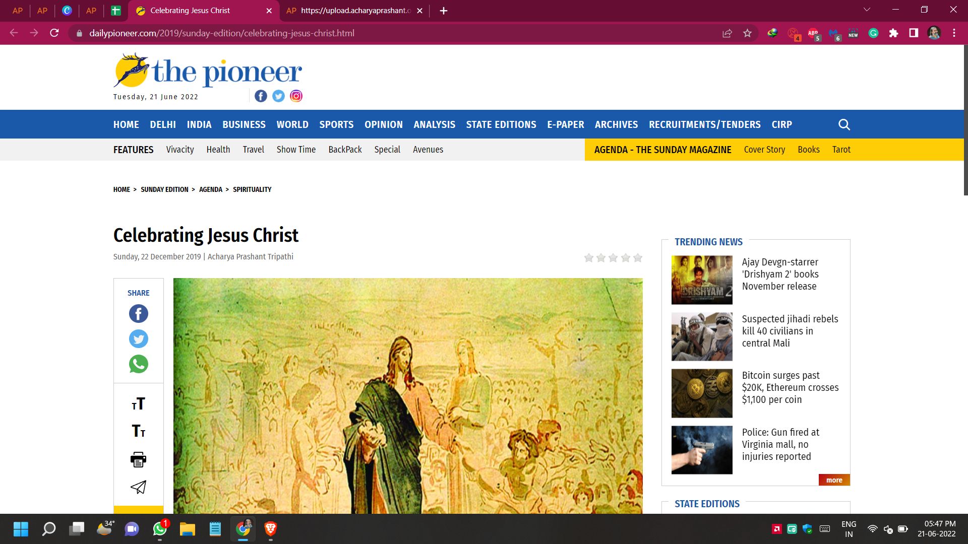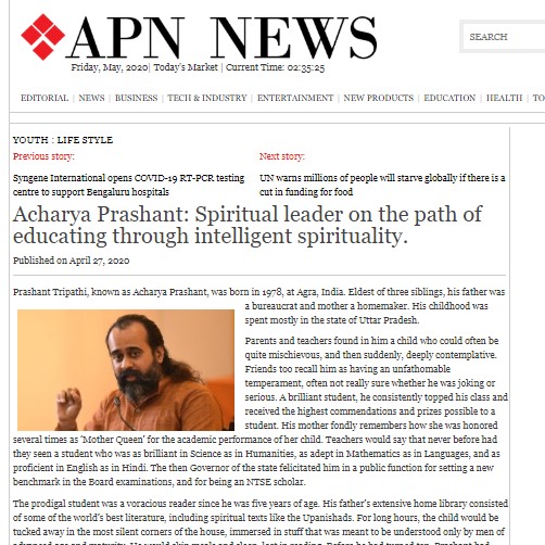 | Media APN NewsAPN News | APN News – Acharya Prashants Vision For International Literacy Day From Basic Literacy To Profound Self Awareness  07 Sep 2024  [1]  APN News – Acharya Prashant Spiritual Leader On The Path Of Educating Through Intelligent Spirituality  27 Apr 2020  [1]  Acharya Prashant’s article 'An IIT-IIM Graduate Who Almost Joined RAW Before Becoming a New-Age Spiritual Icon' published in APN News  17 Jul 2019  [1]  |