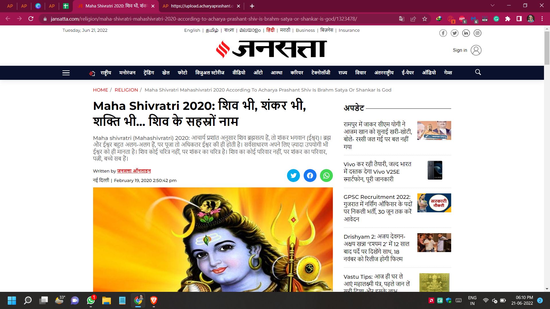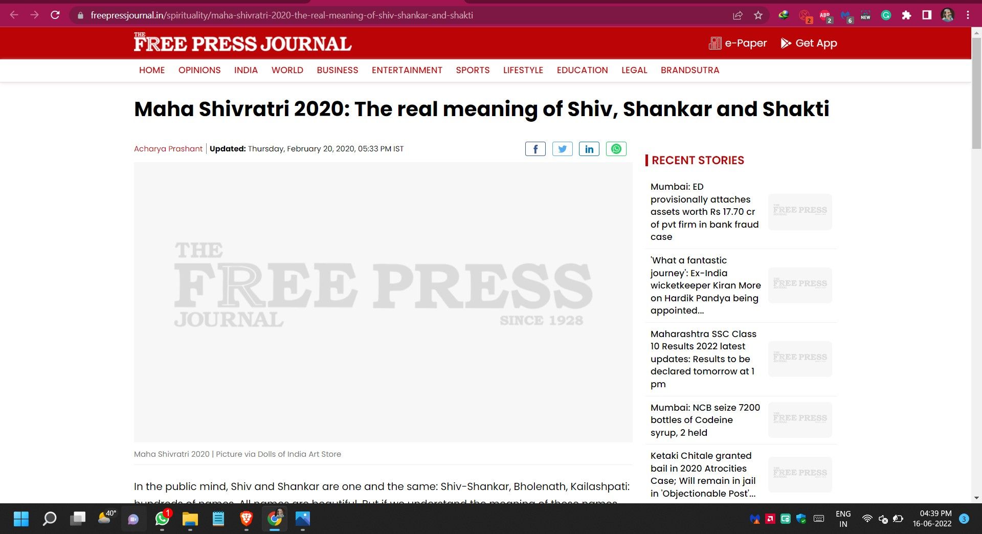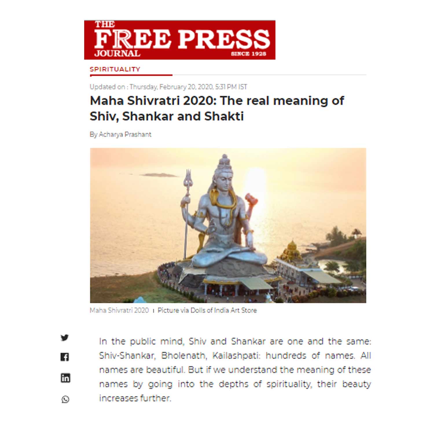 | Media Free Press JournalFree Press Journal | Free Press Journal – Maha Shivratri 2020 The Real Meaning Of Shiv Shankar And Shakti  20 Feb 2020  [1]  |
